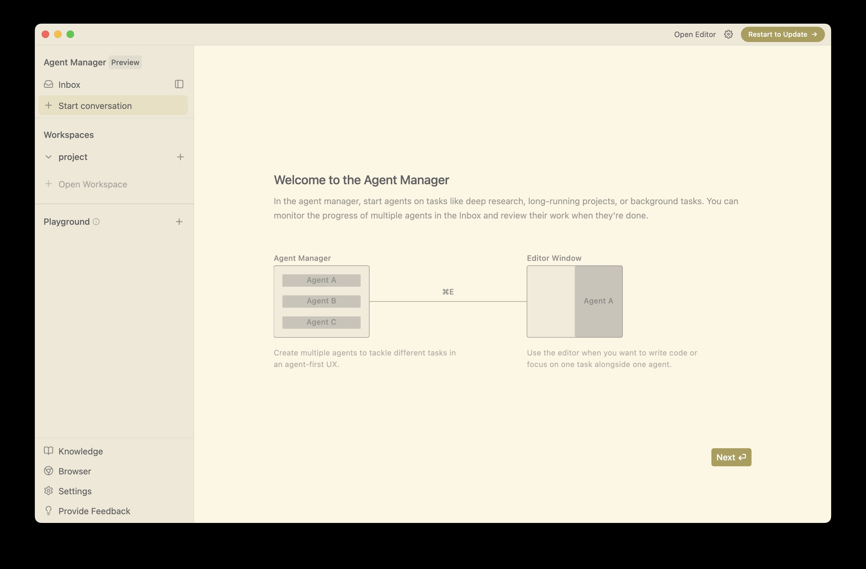 It is a dedicated interface for managing multiple AI Agents. You can have separate agents working simultaneously, one agent building the frontend, another handling backend logic, and a third fixing bugs, etc.